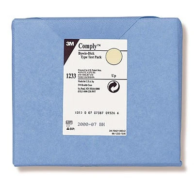 The 3M Comply 00135 Bowie-Dick Plus Test Pack with Early Warning Test Sheet consists of chemical indicators on two test sheets positioned inside porous materials and sealed inside a disposable outer wrap. In addition to the regular Bowie-Dick test sheet, a sensitive early warning indicator sheet identifies problems sooner so the steriliser may be repaired before it must be taken out of use.