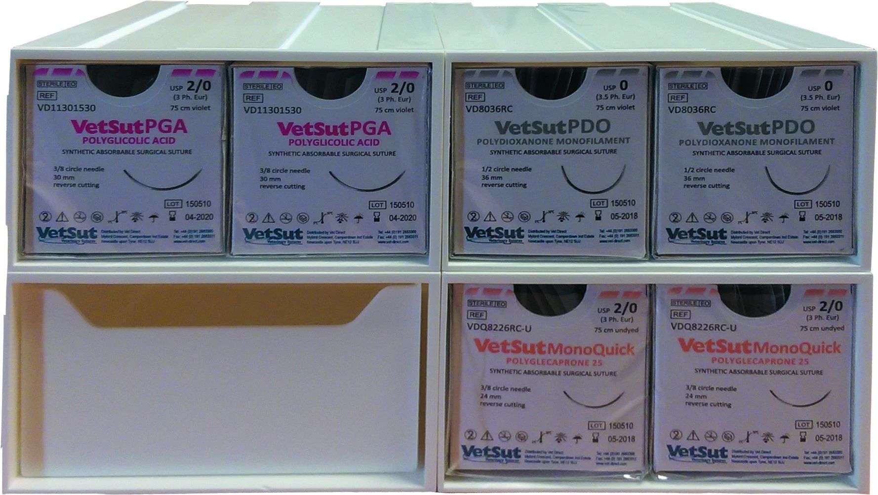 Keep your sutures clean and tidy with these stackable suture racks and draws (for needles and excess sizes). Durable, easy to clean suture rack - fit most common brands. Front loading rack can sit on your counter or trolley.