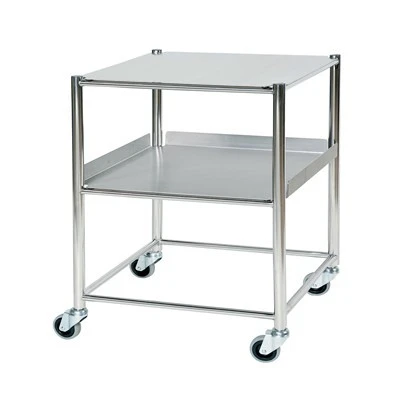 Surgical trolley with white epoxy coated frames and 1 stainless steel shelf and 1 tray  Removable stainless steel shelf (304 grade/DP2 finish) Lift-off stainless steel trays (304 grade/DP2 finish) 2 or 3 stainless steel shelf/tray combinations Shelves & trays locate around frame to prevent movement Shelf/tray protection buffer ring Durable non-marking 75mm castors Polished stainless steel frame (304 grade) 10kg maximum individual tray load Easy clean design 2 year warranty Supplied fully assembled British made