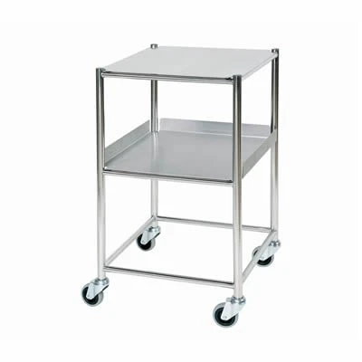 Surgical trolley with white epoxy coated frames and 1 stainless steel shelf and 1 tray Removable stainless steel shelf (304 grade/DP2 finish) Lift-off stainless steel trays (304 grade/DP2 finish) 2 or 3 stainless steel shelf/tray combinations Shelves & trays locate around frame to prevent movement Shelf/tray protection buffer ring Durable non-marking 75mm castors Polished stainless steel frame (304 grade) 10kg maximum individual tray load Easy clean design 2 year warranty Supplied fully assembled British made Delivery normally within 3-4 weeks