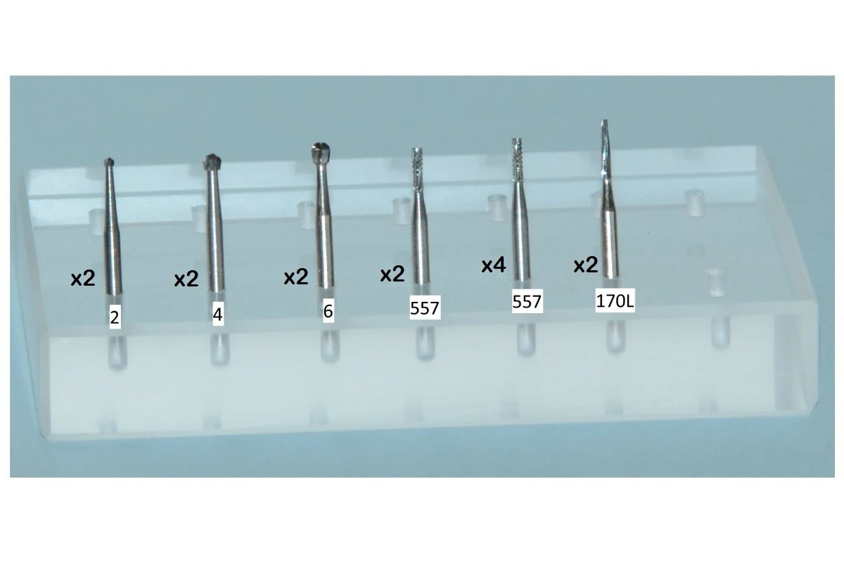 BURS (CARBIDE) FRICTION GRIP 12 Burs including 2 x # 2; 2 x # 4; 2 x # 6; 4 x #557 and 2x #170L with Acrylic Block Highest quality Tungsten Carbide Tips brazed onto the neck of a stainless steel shank