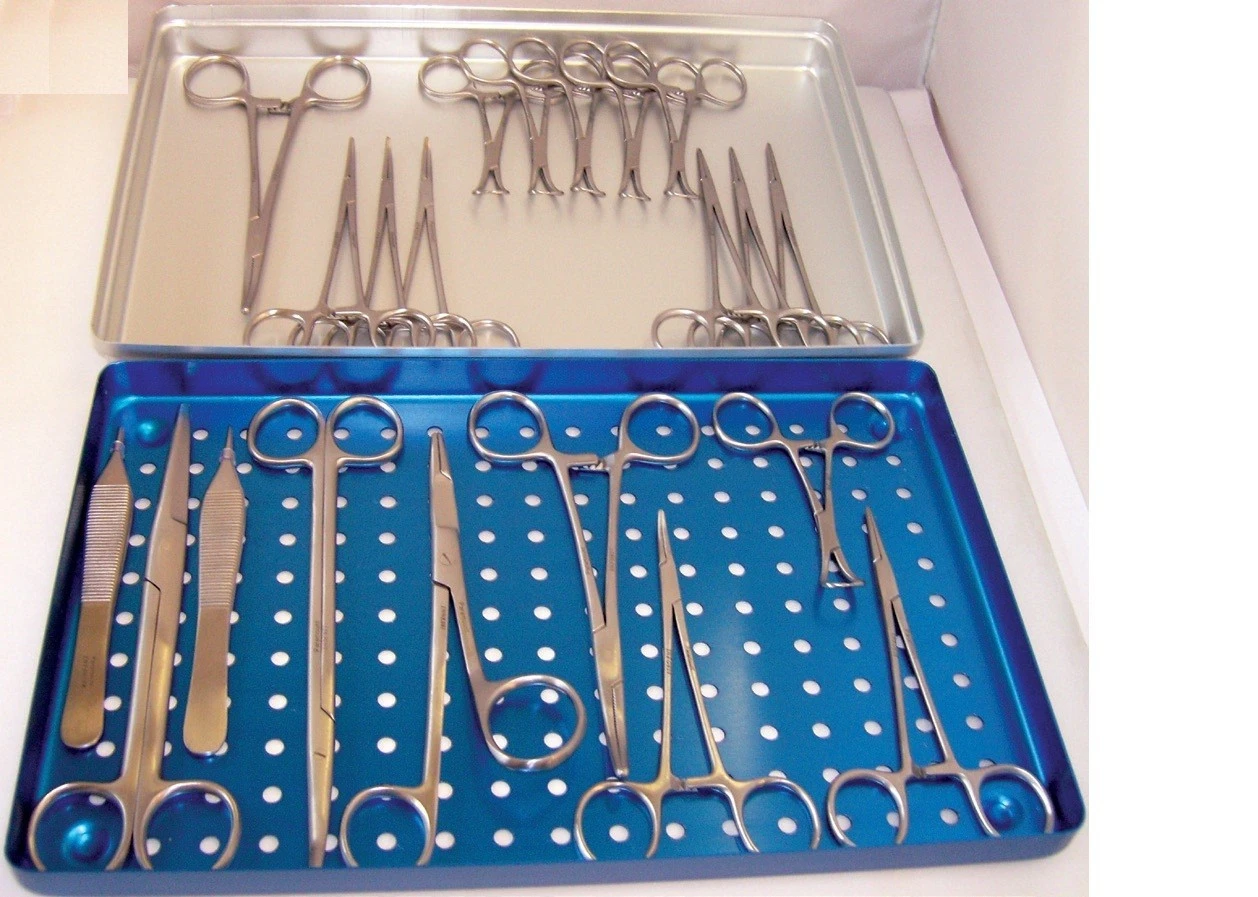 Contains: Towel Clips 90mm x6 Metzenbaum Scissors Curved 180mm x1 Mayo Scissors Straight 160mm x1 Adson Dressing Forceps 120mm x1 Adson Dissecting 1:2 Rat Tooth 120mm x1 Halstead Mosquito Forceps Curved 125mm x4 Halstead Mosquito Forceps Straight 125mm x4 Spencer Wells 150mm x2 Choice Gillies Needle Holder Tungsten Carbide L or R 160mm x1 Choice Autoclave Box Blue