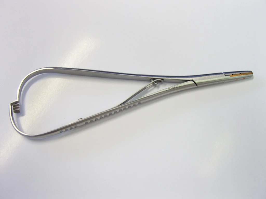 The McPhails needle holder have soft copper jaws to provide extra needle grip. Combined spring and pivot handle - closes at the rack when the needle is compressed and opens when further pressure is applied.