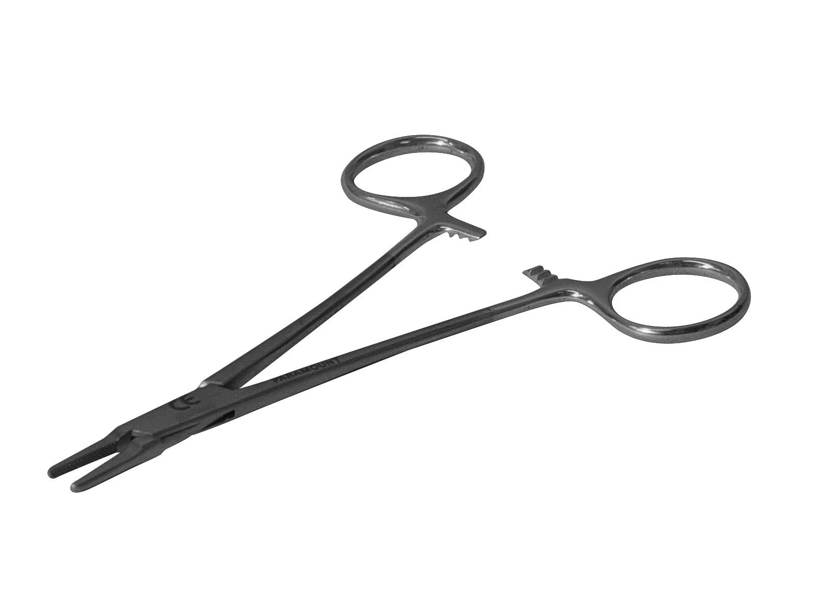 Ryder Needle Holder is a ratcheted, finger ring instrument that features narrow jaws and is commonly used with very small suture needles - TC jaws